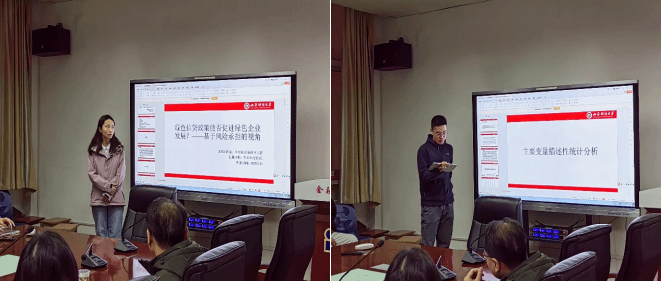 认真听取汇报后,同学们经过深入思考,就该主题提出了相关疑问。同学们的问题主要聚焦于:论文将绿色实质性创新激励与提高银行信贷供给意愿作为机制变量,二者是否存在优先级差异或因果关系?文章通过异质性分析发现,绿色信贷政策对不同企业类型的影响存在一定差异,此差异对金融政策制定有何启示?针对第一个问题,汇报小组进行了解答:在文章中,这两个变量作为机制变量并不存在因果关系,但两者之间确实存在一定关联,信贷政策会对银行信贷供给意愿产生正向影响。针对第二个问题,汇报小组指出:金融政策制定可更具针对性,对于小微企业可加大信贷支持力度并提供更多风险补偿;政策制定应基于公司财务状况与所属行业,形成差异化政策;同时,绿色信贷政策可与其他政策协同发力,发挥协同效应。