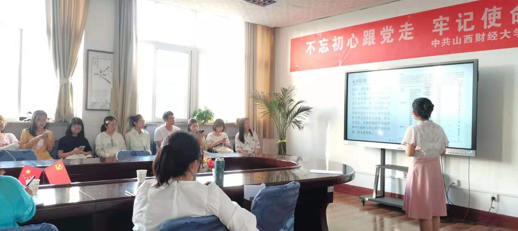 本次学术沙龙活动由20级研究生范利洁同学主讲,主讲同学从定义、发展历程、相关文献、文献详解四个方面进行讲解。首先在定义方面,主讲同学对绿色债券的定义以及范围做出了简要的介绍;发展历程中,主要从国际和国内两方面进行分析,并以时间轴的形式列举了发展的具体进程,内容条理有序;最后给同学们列出了相关文献,并着重以一篇外文文献为主进行详细的分析介绍,辅以模型进行分析,主讲团队整体论述框架完整,内容详细,赢得现场同学一片热烈掌声。