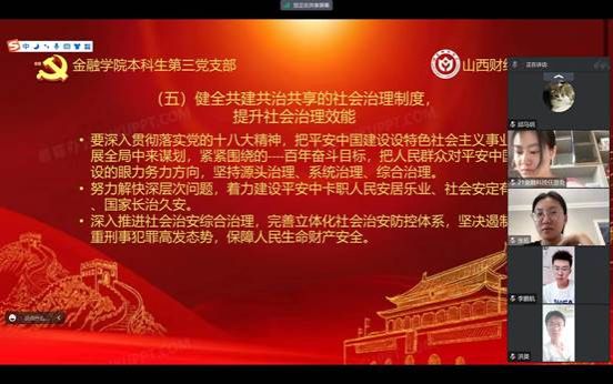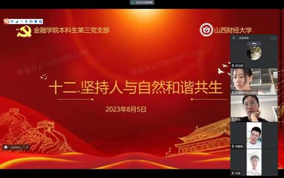 本科生第三党支部在8月5日进行了第十二章和第十三章的学习,本讲的主要内容是“坚持人与自然和谐共生”和“坚决维护国家安全和社会稳定”,由本科生第三党支部预备党员张拓带领大家学习,本科生第三党支部邱马玥主持并总结发言。