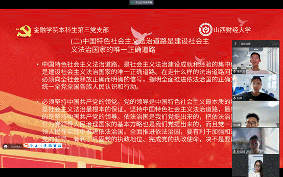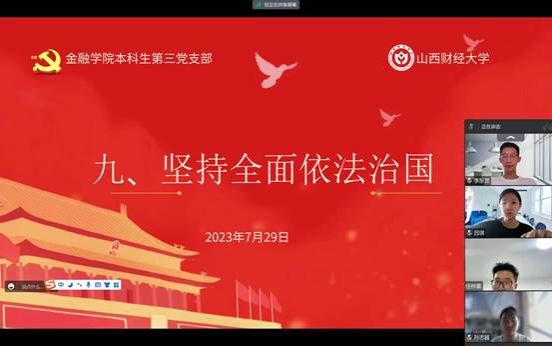 本科生第三党支部在7月29日进行了第九章和第十章的学习,本讲的主要内容是“坚持全面依法治国”和“铸就社会主义文化新辉煌”,由本科生第三党支部预备党员季雅婧带领大家学习,本科生第三党支部邱马玥主持并总结发言。
