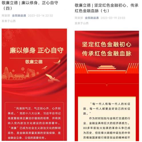 公众号“金院融益通”开设“敬廉立德”专栏,截止目前累计专题17期,阅读量达2000多,营造了良好的清廉育人环境。