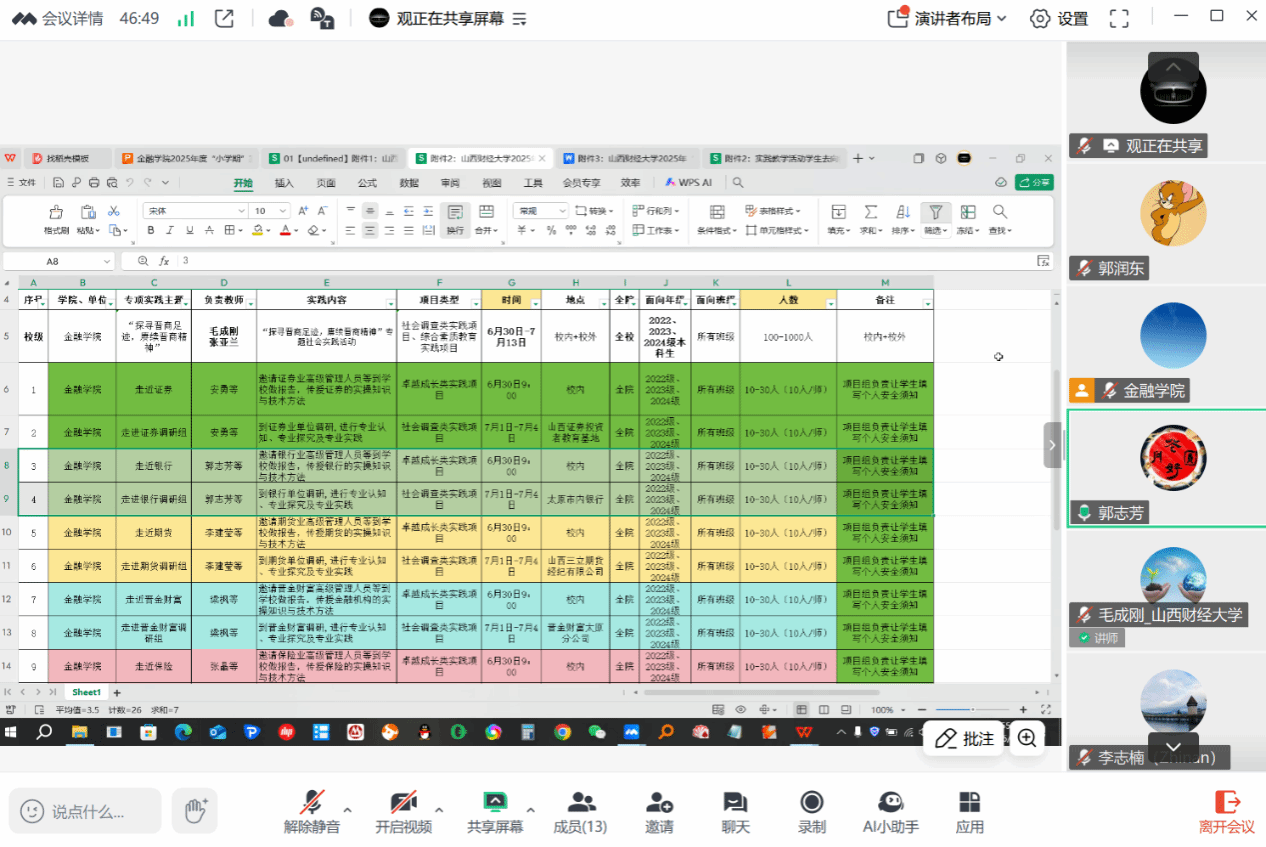 会议第二项,毛成刚老师对 “小学期” 校级实践项目 “探寻晋商足迹,赓续晋商精神” 进行了详细介绍。首先,他阐述了该项目开展的意义,让同学们认识到这一项目对于传承晋商精神、了解晋商文化的重要性;接着介绍了实践地点,使同学们对实践的具体场所有所了解;还分享了研究设想计划,让同学们对项目的研究方向和目标有了清晰的把握。其次,毛成刚介绍了该项目开展所应用的田野调查、实地访谈、文献资料查阅等具体研究方法,这些方法为同学们开展研究提供了有力的指导;同时说明了同学们最终完成该项目所需要完成的成果形式,让同学们明确了自己的任务。最后,毛成刚展示了部分往年调研实践成果,这些成果不仅展现了以往学生的优秀表现,也为同学们提供了参考和借鉴。