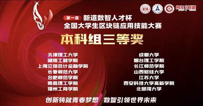承办,新道科技股份有限公司提供全程技术支持。大赛旨在推进区块链数字产业实践育人工作的开展,深度对接互联网+创新创业产业赛道命题,提高区块链人才的培养质量。比赛通过“理论+实践+方案”三位一体的考核方式,促进培养学生的区块链意识及创新思维,帮助学生借助区块链技术探索解决实体产业变革问题,加快促进区块链基础知识在高校的普及和创新能力提升,使学生能够运用所学区块链知识,正确认知区块链技术及区块链应用场景,真正理解区块链的核心价值,并能够结合区块链技术特征解决行业应用问题,塑造学生基于区块链技术的创新意识、创造精神及创新能力。