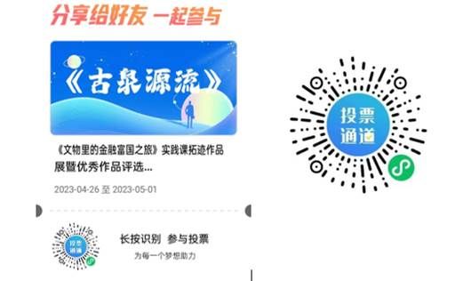 《文物里的金融富国之旅》实践课拓迹作品展优秀作品评选活动开始啦!所有好友均可参与投票,喊上亲朋好友为你扫码投票吧!