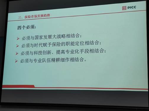 张弛老师带我们领略了保险市场的发展趋势,根据发展规律,行业发展必须遵循以下四方面:1.必须与国家发展大战略相结合;2.必须与时代赋予保险的职能定位相结合;3.必须与科技创新、提高专业化手段相结合;4.必须与专业队伍精耕细作相结合。张弛老师给我们详细介绍了中交兴路风险控制系统,安全生产风险控制系统,让我们对保险科技、保险人将来真正应该用心去做的内容,以及未来保险业的发展方向有了更多的了解与思考。
