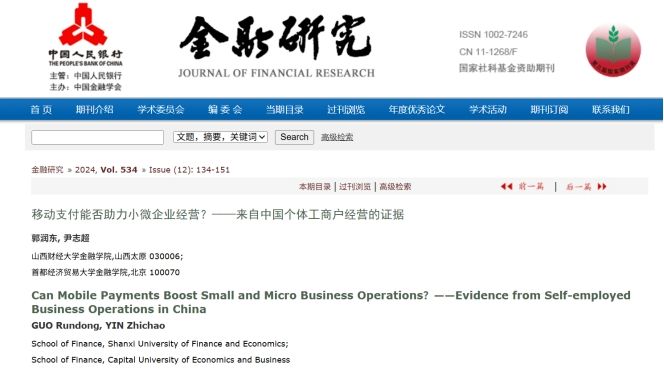 尹志超教授合作的论文《移动支付能否助力小微企业经营?——来自中国个体工商户经营的证据》在金融学领域顶刊《金融研究》2024年第12期正式发表。